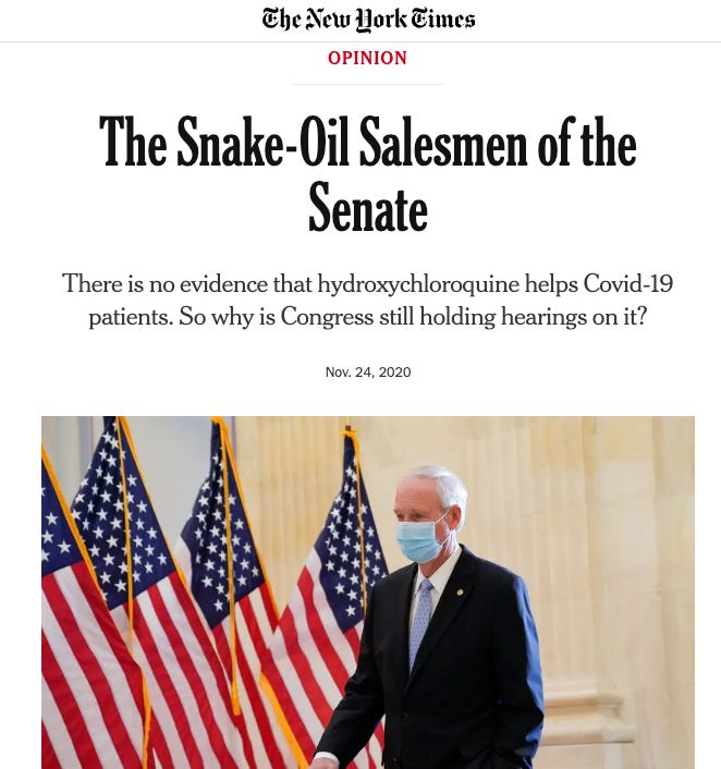Bastards. Know that headline was not written by journalists. Written by PR professionals (propagandists) heading up the HCQ Disinformation campaign. Still have to admit it was effective as they have been using that “snake oil” phrase on a ton of us. It works. But I hope less so over time as the emerging data shows that many of us “dissidents” were correct in out early and accurate advocacy on numerous pandemic related scientific topics.
