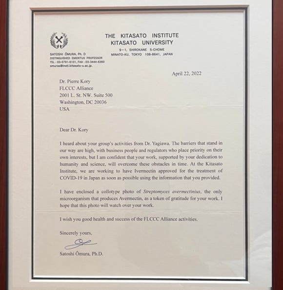 I have to say that one of the absolute highlights of my and the FLCCC’s journey through COVID (and there have not been many) was when we received the below supportive letter and gift from Professor Omura and the Kitasato Institute - an amazingly beautiful spectrograph of the Streptomyces Avermectus that secreted avermectin, the parent compound to ivermectin, the discovery of which led to his Nobel prize. Along with his warm and supportive letter, both hang over me as I work from my desk. And always will.