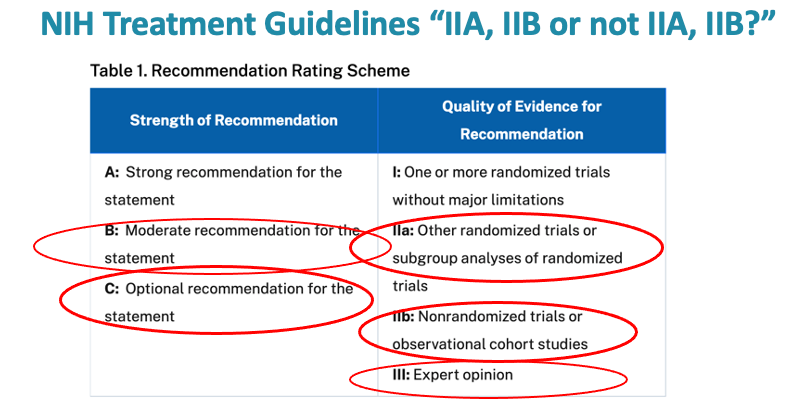 So they instead moved their existing recommendation of “do not use outside of a clinical trial” to one of “there is insufficient evidence to recommend or not recommend ivermectin.” So, we accomplished something but somehow, in this new mad, mad world, even though they no longer specifically recommended against ivermectin, this still didn’t prevent doctors from losing licenses for prescribing. Also, check out what I call the NIH pause at 2:08 during the Q and A.
