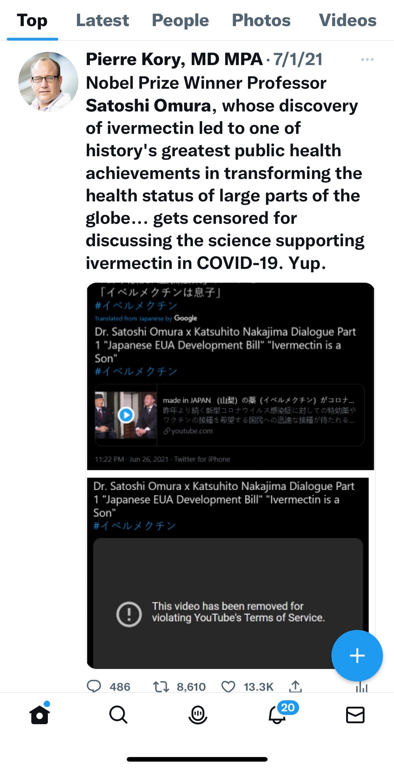 Now I don’t feel so bad about all the attacks on me and the FLCCC as we are not Nobel Prize winners. One last fun fact: due to my expertise on ivermectin and membership in the FLCCC, I slowly became quite popular on Twitter, now at 268,000 followers. You want to know what my most popular tweet was since I started tweeting? It was me tweeting that YouTube pulled down an interview with Nobel Prize winner Satoshi Omura on the use of ivermectin. Check out the number of re-tweets for someone not named Elon Musk.