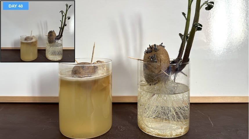 The photos above show two potatoes at Day 48: the potato on the left was placed in a glass filled with tap water, while the potato on the right was placed in a glass of water treated with Shimanishi’s minerals. As you can see, the potato on the left sits rotting in turbid, brown water, while the potato on the right sits in clear water with a spiderweb of roots, sprouting a tall shoot (the one-foot height is pictured in the upper left).