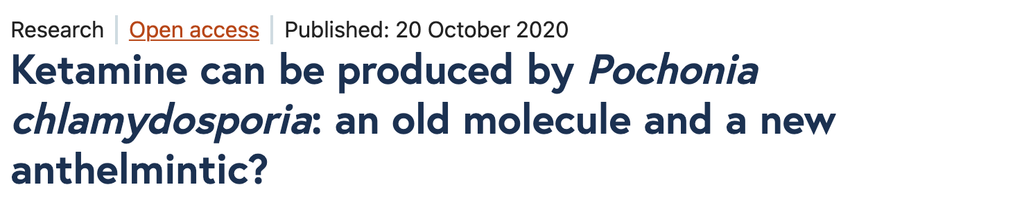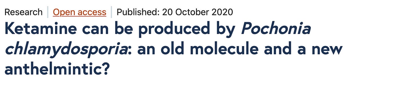 But get this: one of my ketamine mentors, psychiatrist Mitchell Liester of Colorado, had sent me a paper just a few months ago, published in 2020, in which Brazilian researchers reported discovering a “natural” source of ketamine —specifically a fungus known as Pochonia chlamydosporia.
