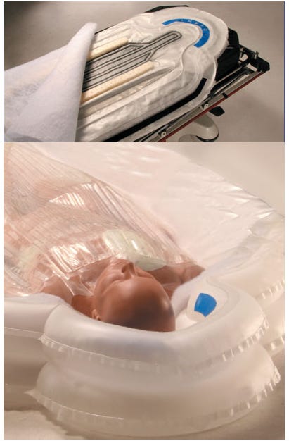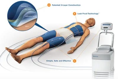 The sloppiness of the method was becoming an issue, plus it was massively labor-intensive while trying to care for 16-20 critically ill patients a day. As the leader of the hypothermia program, my hospital asked me to choose a cooling device to purchase for use in patients that was a little less chaotic, labor-intensive, and messy. There were a number of cooling devices on the market.. and I chose the one that was fastest. A device called the “Thermosuit,” which was literally an inflatable bathtub: