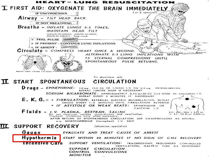 Peter Safar: Did you know that in one of the earliest monographs on how to do CPR (1961), from literally the founder of both CPR and ICU, a guy named Safar in Pittsburgh, had put post-arrest hypothermia as part of the protocol?