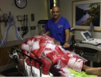Fun Fact: Joe Varon, one of the other founders of the FLCCC, was an even earlier “hypothermiac” in our specialty. I didn’t know him then, but I had come across this picture of him early in my career, and I used to display it in my lectures (this was before I later would meet him and partner with him in forming the FLCCC). Check out his method of cooling. No wonder we would later become FLCCC brothers.