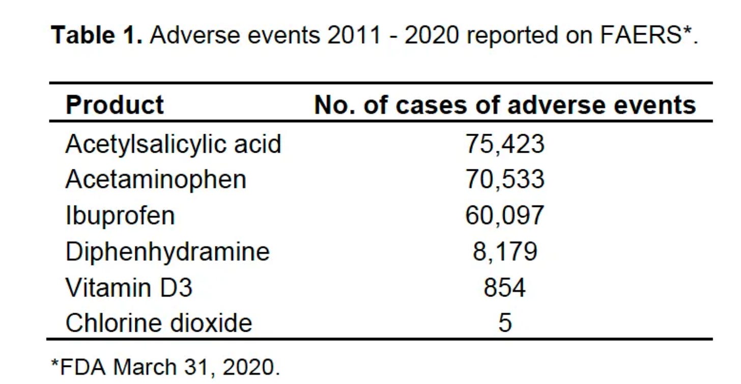 Another safety assurance is knowing the “LD50”, which is the dose required to kill half the test population (typically rats), and then comparing the LD50 of chlorine dioxide to that of other popular medicines and supplements. To wit: