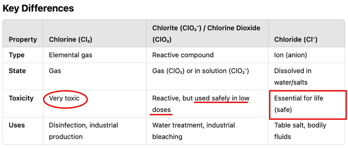 See the below AI-generated table comparing chlorine, chlorite, chlorine dioxide, and chloride. Notice the column which combines chlorite and chlorine dioxide as equivalent given that they are interchangeable as a gas or salt in physiologic solutions: