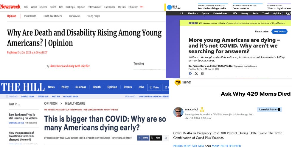 We have now published three Op-Ed’s on the excess mortality and disability rate spikes which have occurred subsequent to the Covid mRNA campaign (and particularly its mandates) in USA Today, Newsweek, and The Hill. We also published an Op-Ed on the massive surge in maternal mortality in 2021 beginning right after mRNA vaccines were widely recommended to pregnant women (with almost no safety data) by the American College of Obstetrics and Gynecology and the CDC.
