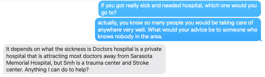 Although my colleague pointed to a different hospital that was more “trusted” to give good medical care, my post-covid hospital phobia (i.e. PTSD) is pretty refractory to such suggestions. I just flat out refuse to go to a hospital unless I absolutely need to, which, in my mind, means that I have to be unconscious and my partner Lisa would be forced to call an ambulance. I only plan to wake up in a hospital, not voluntarily walk into one. If that were to happen at this point in Sarasota though, I wonder what kind of care this guarantees me after I publish this post (let alone the last post)?