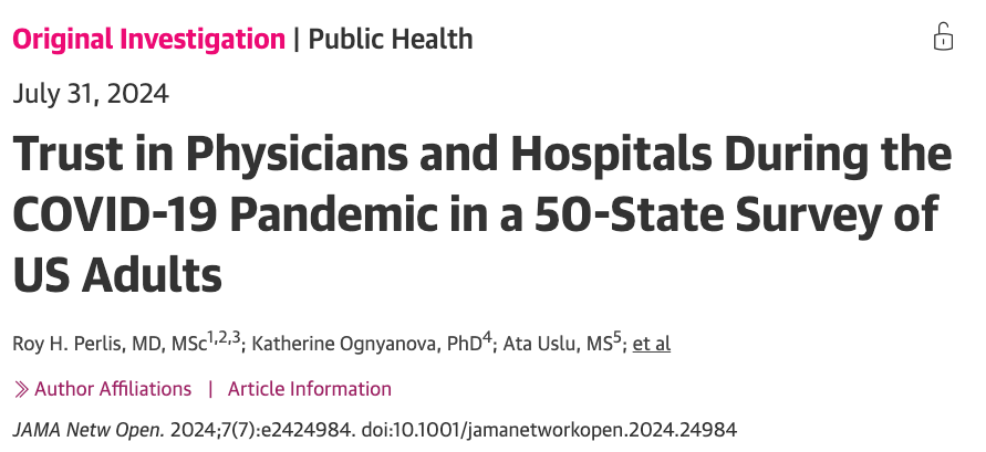 This post-Covid condition in the U.S is the unfortunate consequence of what has already been documented in the medical literature, i.e. the massive lost of trust in physicians and hospitals by Americans during Covid as reported in this survey study from JAMA where they found that “trust” dropped from 71.5% in 2019 to 40.1% in early 2024. This to me, is an unsurprising result of our medical system’s scientifically absurd and ethically demoralizing Covid response, leading to the fact that now significantly less than half of Americans trust their doctors or hospitals: